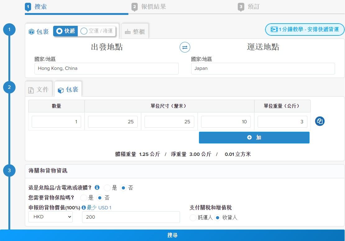 免費登記,登入FreightAmigo平台 後於即時報價頁面,輸入貨物資料如出發地點/運送地點,選擇類型”包裹”及輸入數量、單位尺寸及重量,然後按”搜尋”。