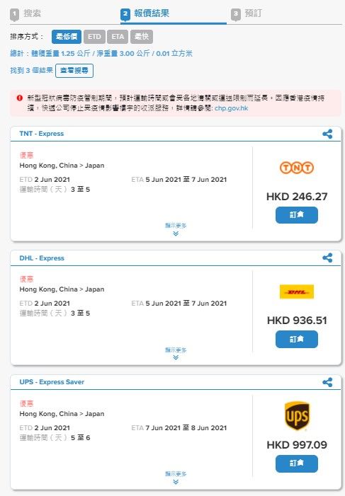 FreightAmigo根據輸入的貨物資料,會立即列出不同國際快遞公司的運費報價選擇及所需運輸時間讓您比較。您可以立即看到最便宜的價格,看到心儀的選擇後,可以 按 “訂倉” 下單。如果您是急於寄件的,可以於排序方式選擇 “最快“,就會立即看到最短運輸時間的報價了 ~