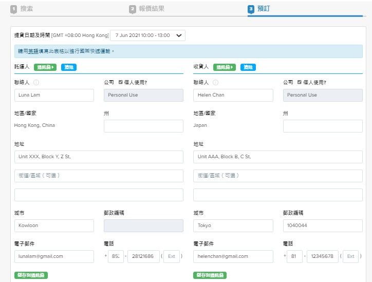填妥相關寄件資料,i.e. 提貨日期及時間,託運人/收貨人地址等,並選擇付款方式進行線上預訂。